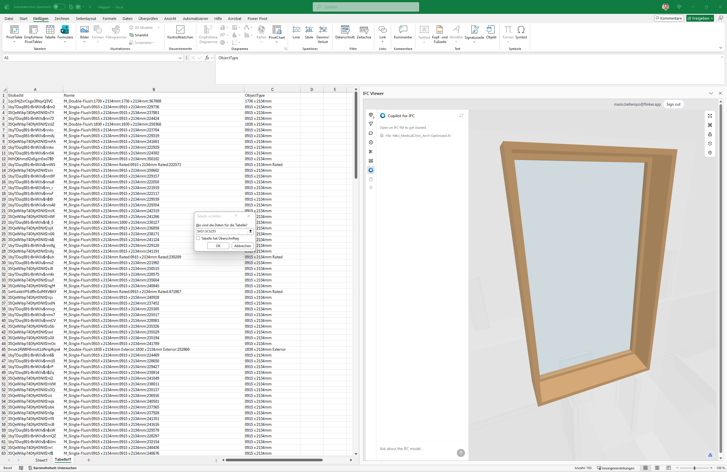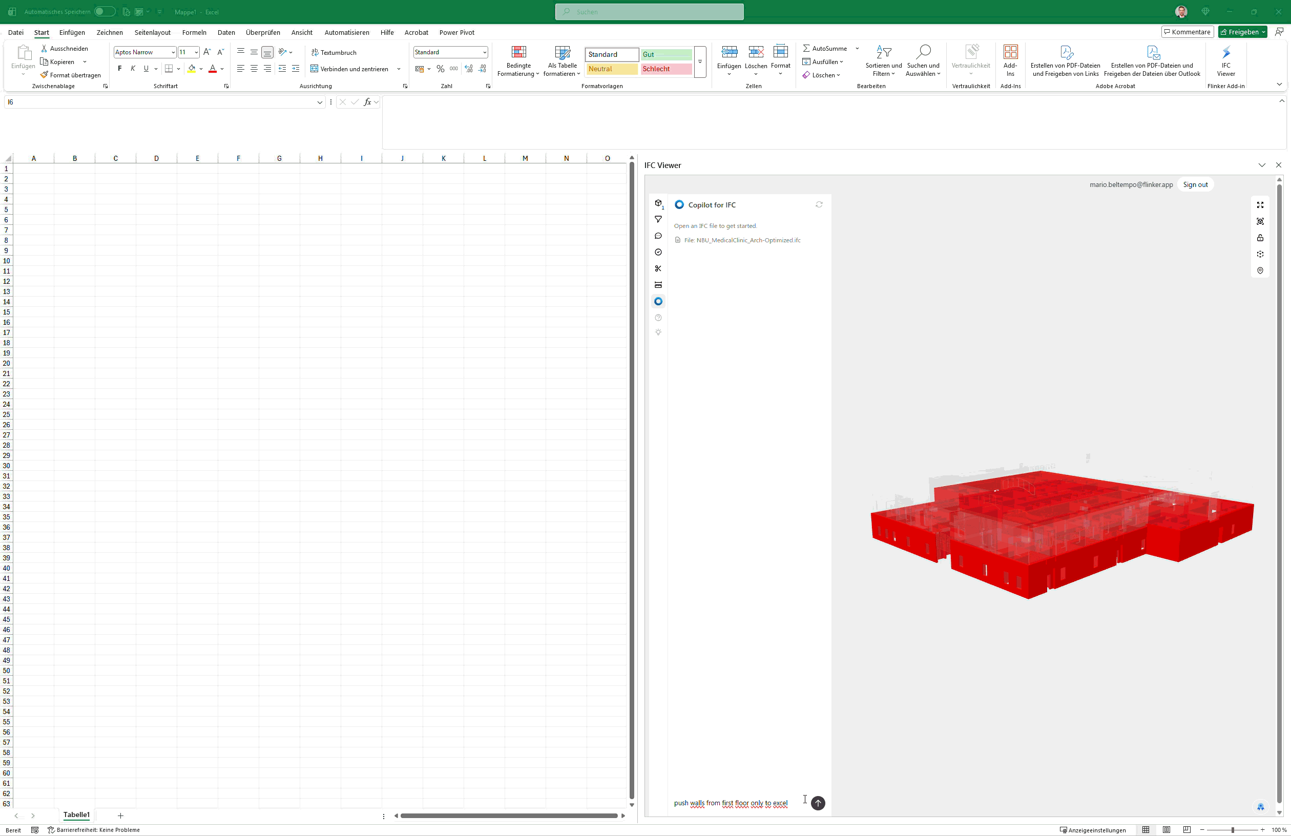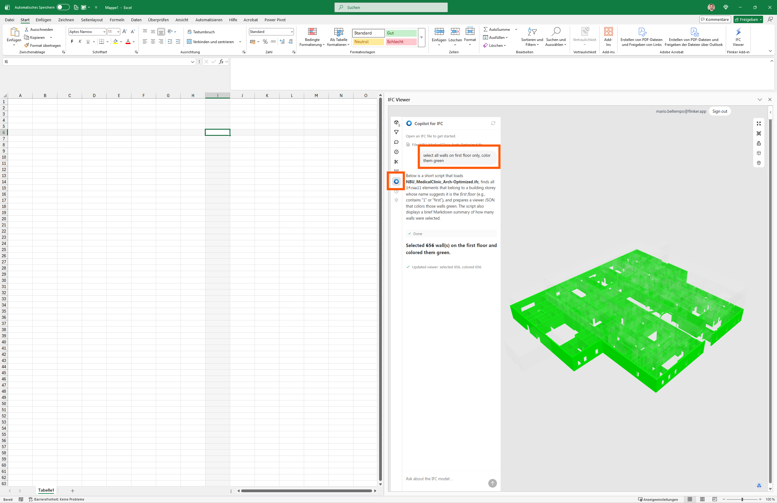The Flinker IFC Viewer for Excel closes this gap by making the IFC model queryable from inside Excel. Combined with Copilot for IFC — a natural-language interface for executing scripts against the loaded model — a BIM coordinator or project manager can extract a structured list of elements by storey and type, push them directly into a spreadsheet, and build a live status tracking table in minutes, without any additional software, without manual data exports, and without leaving Microsoft 365.
