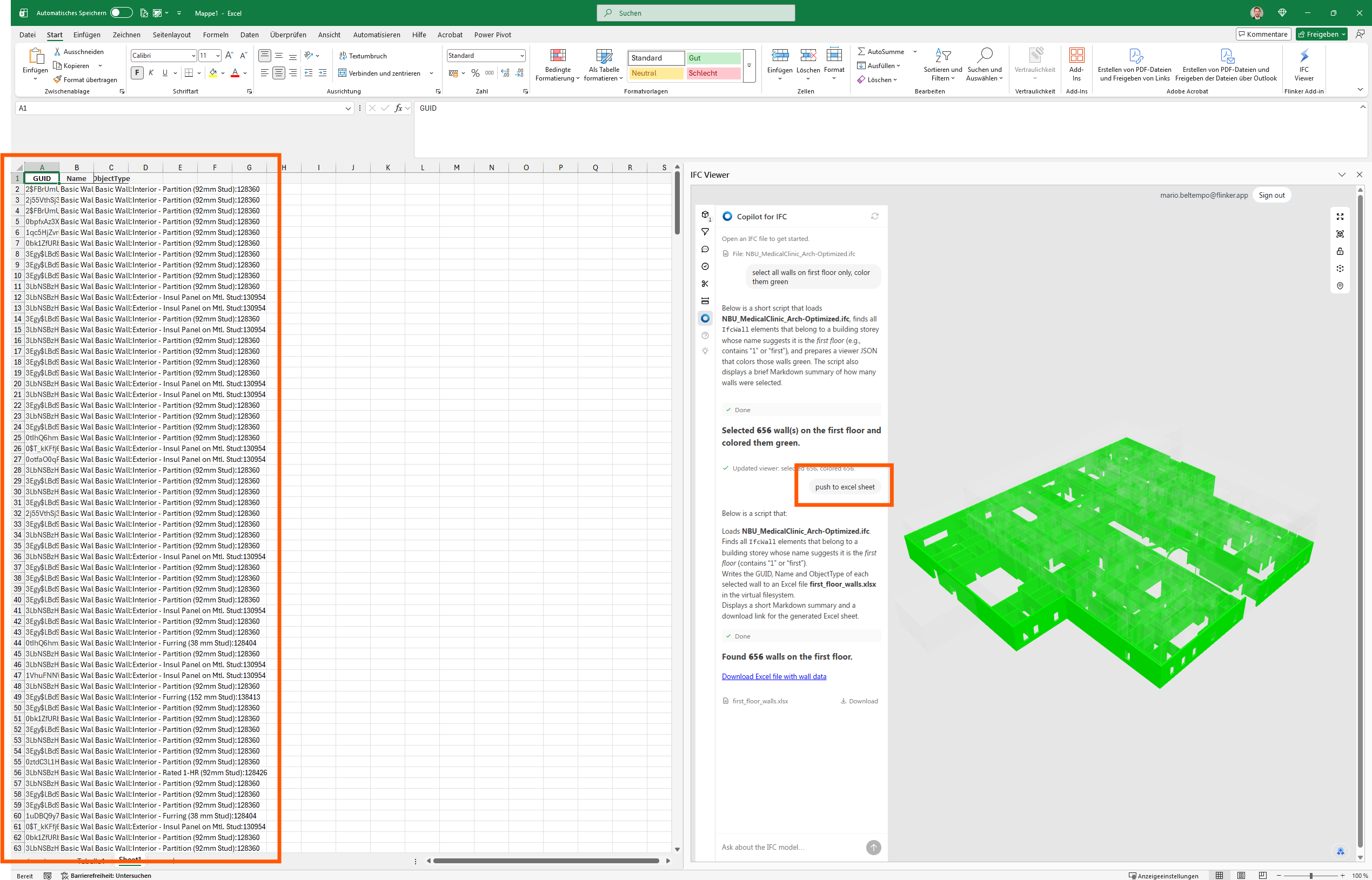 With elements selected in the viewer, Copilot presents a “push to Excel sheet” action. Clicking this writes the structured element table directly into the active Excel workbook. Each row corresponds to one IFC element: