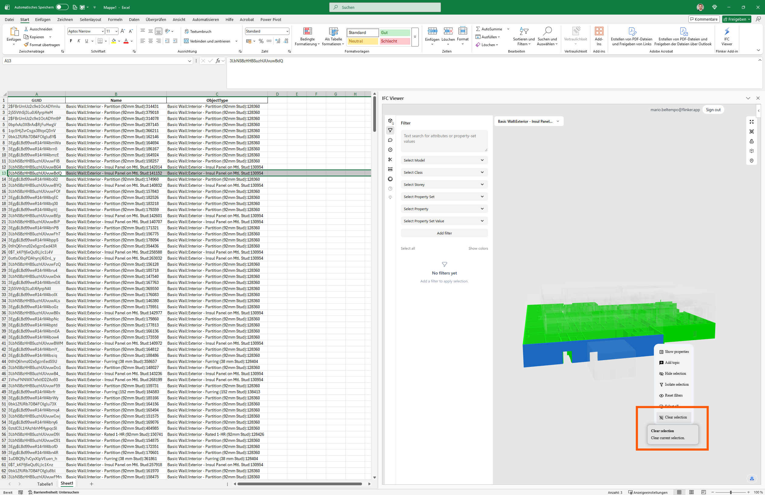 The Filter panel and element selection work bidirectionally between the viewer and the spreadsheet — isolate a type in the viewer to cross-check against the status rows in Excel.