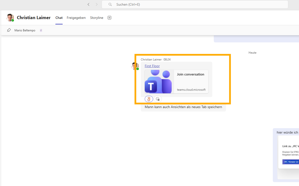With the IFC Viewer in Teams, the model becomes accessible in the owner’s existing environment without requiring them to acquire or learn a BIM authoring tool. A design team member shares a deep link to the affected elements in the project channel or in a meeting chat. The owner follows the link, inspects the elements, reviews the properties, and responds in the same thread — without a mediated session, without a screen share, without waiting for the next scheduled review meeting.